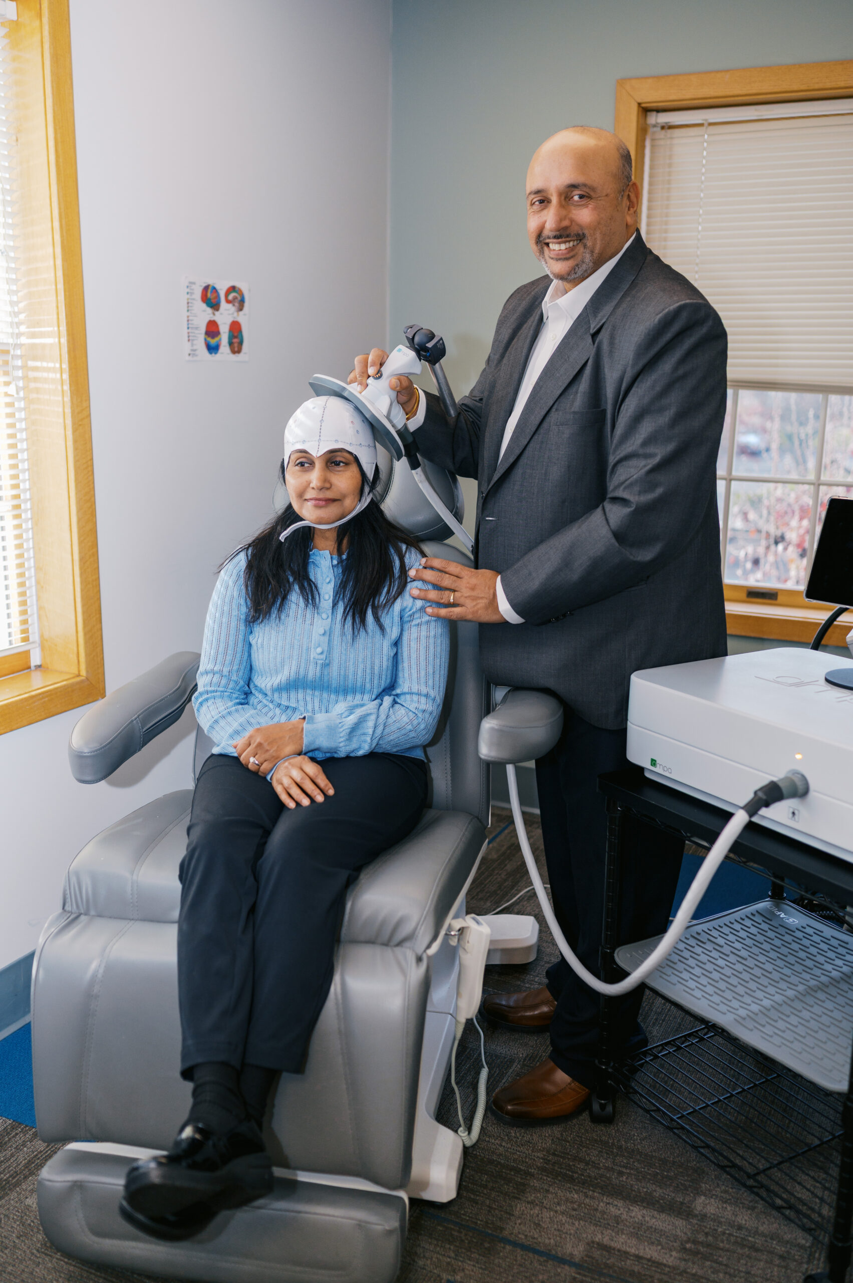 Our TMS physician always prescribes TMS and determines the initial motor threshold (the optimal amplitude of treatment). The treatment itself is administered by an experienced TMS technician under the supervision of the TMS physician. They will always be present to monitor the patient during the treatment. The patient can stop a treatment at any time by requesting the staff member present.